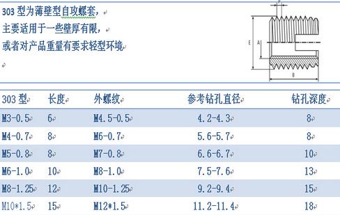 薄壁型佛山自攻螺套外观上看主要有两种区分,一种是一端开槽型的,另一种是一端三圆孔型的,其中开圆孔型的又分为307型和308型两种,307型和308型外观主要区别就是同一直径下,长度和外径大小有所区分。以上各种型式螺套均具有自行攻牙功能。